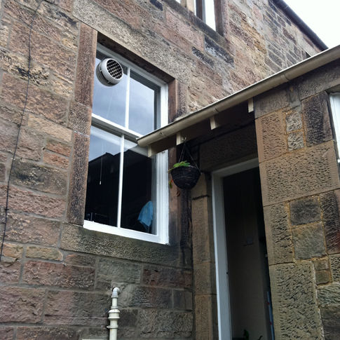 The hall was extended into the old dining room and a utility added to double up as a secondary kitchen. Rather than letting the old kitchen become an inner room we kept the roof level below the window sill so that it could be used as an occasional guest bedroom. An new Juliette balcony in the old doorway to the outshot now looks down to the new kitchen.